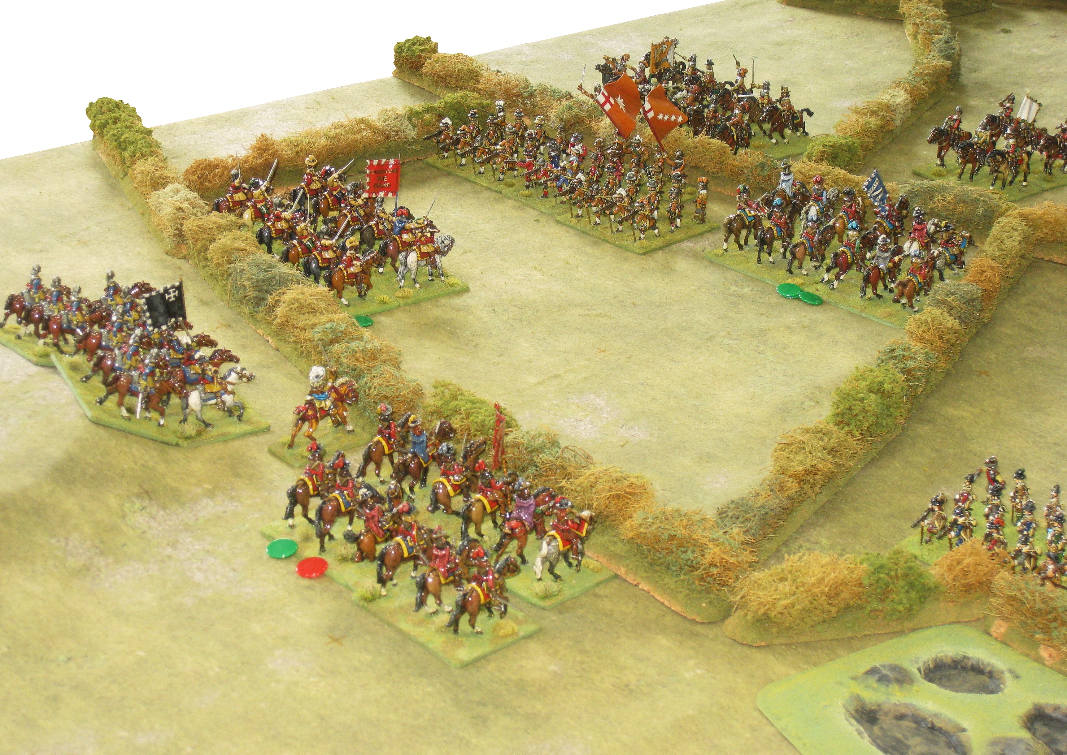 In the next turn the card-driven randomised move sequence handed the victorious Parliamentarian cavalry a chance to charge before their fleeing opponents could act, and so caught them in the rear and up against the 'bloody hedge' and wiped them out.